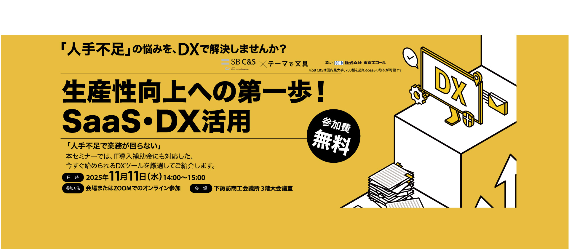 11月11日(火)14:00~15:00 下諏訪商工会議所にて弊社主催 地元事業者様向けのSaaSセミナーを開催いたします。 人手不足・物価高により今後さらに経営環境が厳しくなると予想されるなか、社内DX化で生産性向上を目的としたセミナーとなっております。 ZOOMでも視聴可能ですので、お気軽にご参加ください。 参加申込みフォーム https://forms.gle/VVbY5s9pHFtfLw1h9